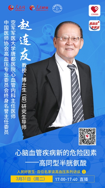 2020年3月31日(周二) 17:00-17:40,“人民好醫生”客戶端將邀請中國醫師協會高血壓專業委員會終身名譽主任委員、空軍軍醫大學唐都醫院心血管內科主任醫師、教授、博士生(后)研究生導師趙連友進行視頻直播,為您介紹心腦血管疾病新的危險因素——高同型半胱氨酸。