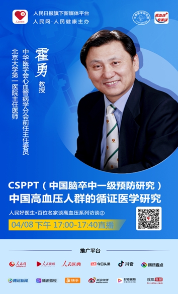 2020年4月8日(周三)17:00-17:40,“人民好醫生”客戶端將邀請中華醫學會心血管病學分會前任主任委員、北京大學第一醫院主任醫師 霍勇教授進行視頻直播,為您介紹CSPPT(中國腦卒中一級預防研究)——中國高血壓人群的循證醫學研究。