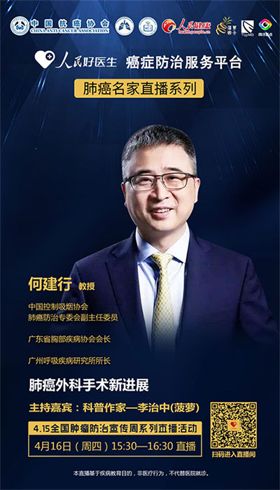 2020年4月16日(周四)15:30-16:30,人民好醫生客戶端邀請到中國控制吸煙協會肺癌防治專委會副主任委員、廣東省胸部疾病協會會長、廣州呼吸疾病研究所所長何建行進行視頻直播訪談,在線分享肺癌外科手術新進展。
