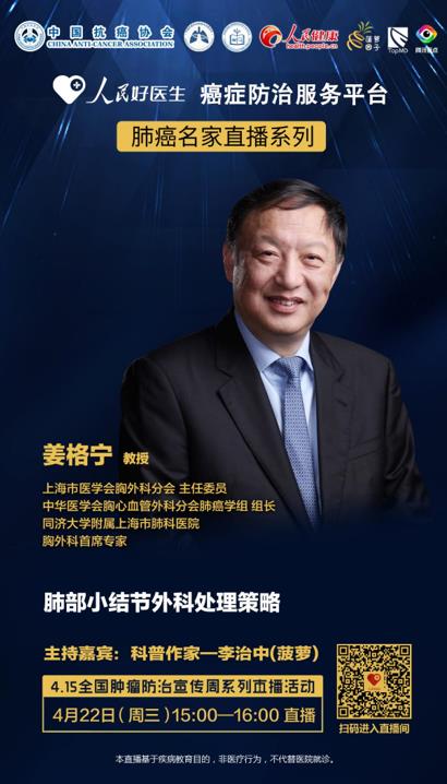 2020年4月22日(周三)15:00-16:00,人民日報社旗下新媒體平臺“人民好醫生”客戶端將邀請上海市醫學會胸外科分會主任委員、中華醫學會胸心血管外科分會肺癌學組組長、同濟大學附屬上海市肺科醫院胸外科首席專家姜格寧進行視頻訪談,在線科普“肺部小結節外科處理策略”。
