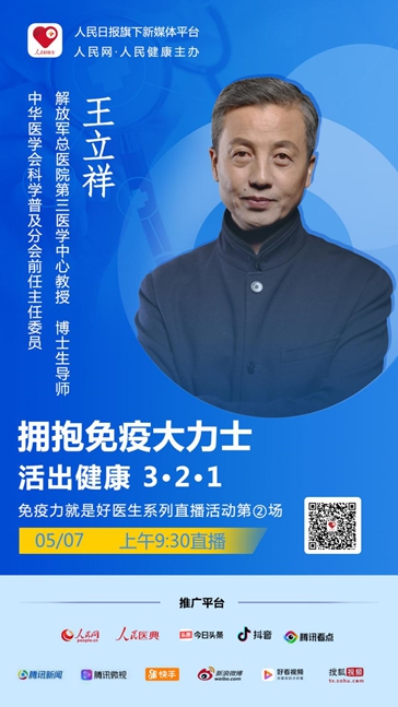 人民日報社旗下新媒體“人民好醫生”客戶端特別策劃“免疫力就是好醫生系列直播活動”。2020年5月7日上午9:30,解放軍總醫院第三醫學中心博士生導師,中華醫學會科學普及分會前任主任委員王立祥教授將進行系列活動的第二場視頻訪談,歡迎屆時收看。