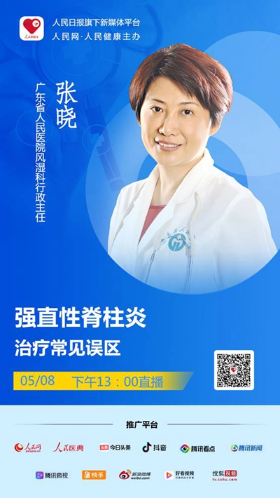 強直性脊柱炎是以侵犯骶髂關節和脊柱為主要臨床表現的炎癥性關節炎,常見于年輕男性,對患者的勞動能力、形象和生活都會帶來一定程度的困擾。強直性脊柱炎主要侵犯人體脊柱,早期主要癥狀為下腰部疼痛,嚴重時會出現如背部僵直這樣的癥狀,故稱之為強直性脊柱炎。但目前,人們對強直性脊柱炎的治療認識存在諸多誤區,導致治療依從性差和效果不佳等情況出現,如該病究竟是否可以根治,是否存在特效藥,偏方是否可信等?2020年5月8日(星期五)13:00-14:00,“人民好醫生”客戶端將邀請廣東省人民醫院風濕科行政主任張曉教授進行視頻直播,與您探討強直性脊柱炎治療的常見誤區有哪些。