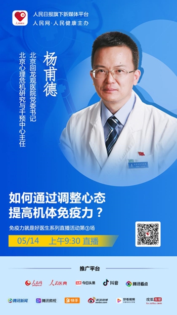 2020年5月14日(周四)上午9:30,人民日報社旗下新媒體“人民好醫生”客戶端將邀請北京回龍觀醫院黨委書記、北京心理危機研究與干預中心主任楊甫德教授進行視頻訪談,與大家在線分享提高機體免疫力的方法。