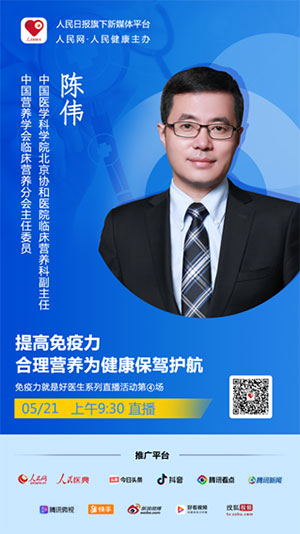 2020年5月21日(周四)上午9:30,人民日報社旗下新媒體“人民好醫生”客戶端將邀請中國醫學科學院北京協和醫院臨床營養科副主任、中國營養學會臨床營養分會主任委員陳偉教授進行視頻訪談,與大家在線分享通過飲食提高免疫力的方法。