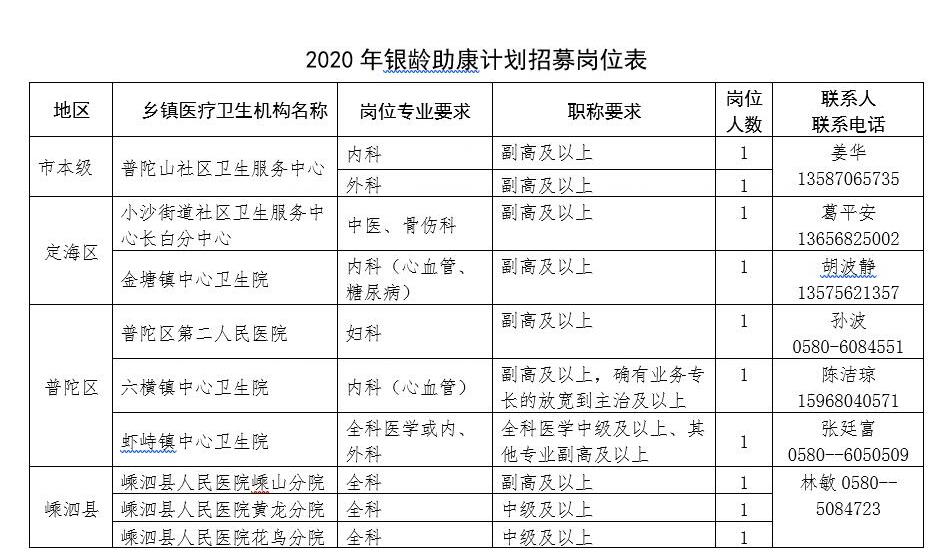 根據《舟山市銀齡助康計劃實施方案》要求,2020年,舟山市決定面向全國公開招聘一批優秀的退休醫師,到我市一些離島或農村的基層醫療衛生機構工作。現將有關事項公告如下: