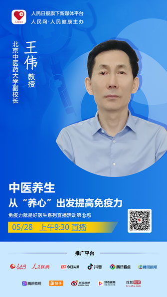 2020年5月28日(周四)上午9:30,人民日報社旗下新媒體“人民好醫生”客戶端將邀請北京中醫藥大學副校長 王偉教授進行視頻訪談,與大家在線分享如何通過中醫養生方式提高免疫力。
