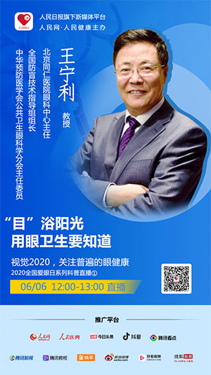 2020年06月06日(周六)12:00-13:00,“人民好醫(yī)生”客戶端將邀請北京同仁眼科中心主任王寧利教授進(jìn)行視頻直播,結(jié)合新冠疫情中近視防控的重點(diǎn),科普怎樣才是正確的用眼衛(wèi)生,千萬不要錯過。