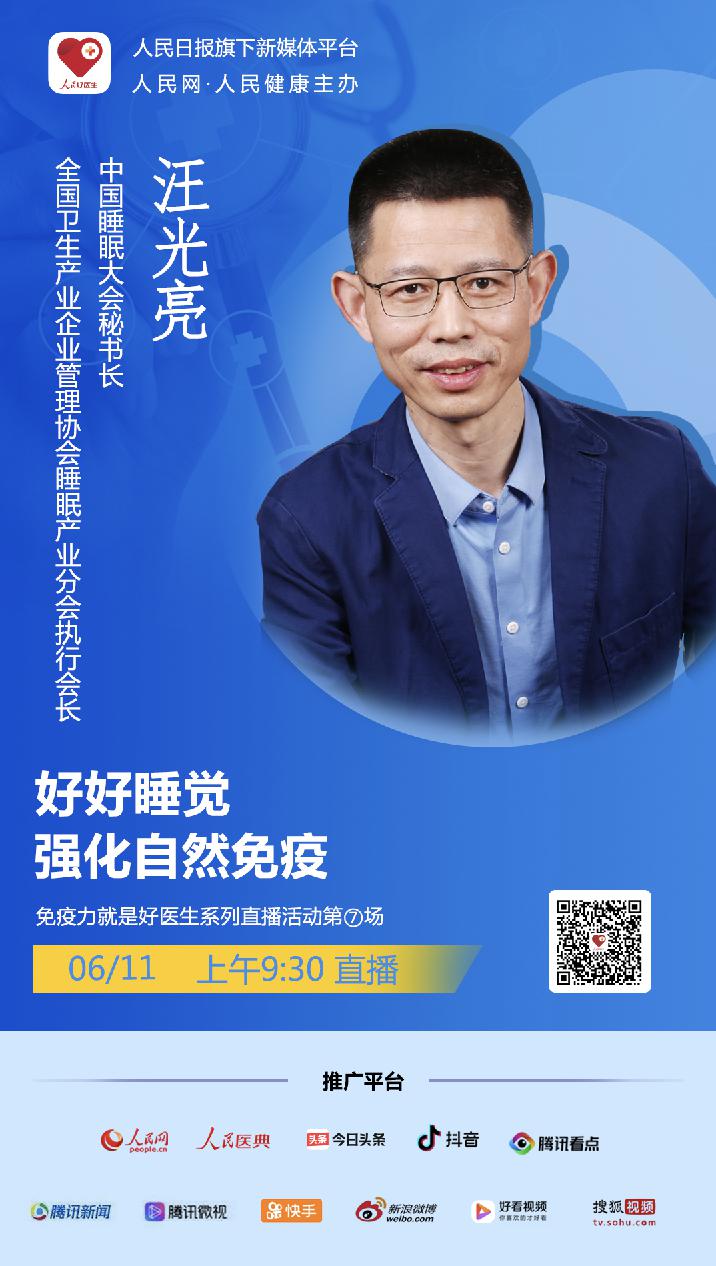 2020年6月11日(周四)上午9:30,人民日報社旗下新媒體“人民好醫(yī)生”客戶端將邀請中國睡眠大會秘書長、全國衛(wèi)生產(chǎn)業(yè)企業(yè)管理協(xié)會睡眠產(chǎn)業(yè)分會執(zhí)行會長汪光亮進行視頻訪談,與大家在線分享如何通過調(diào)節(jié)睡眠強化自然免疫。