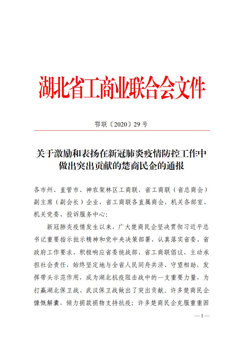 湖北省工商聯(lián)授予運(yùn)鴻集團(tuán)股份有限公司為楚商民企抗疫杰出貢獻(xiàn)獎(jiǎng)