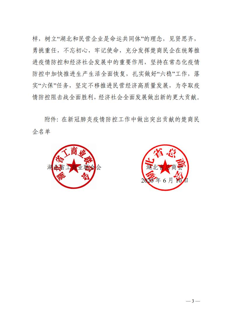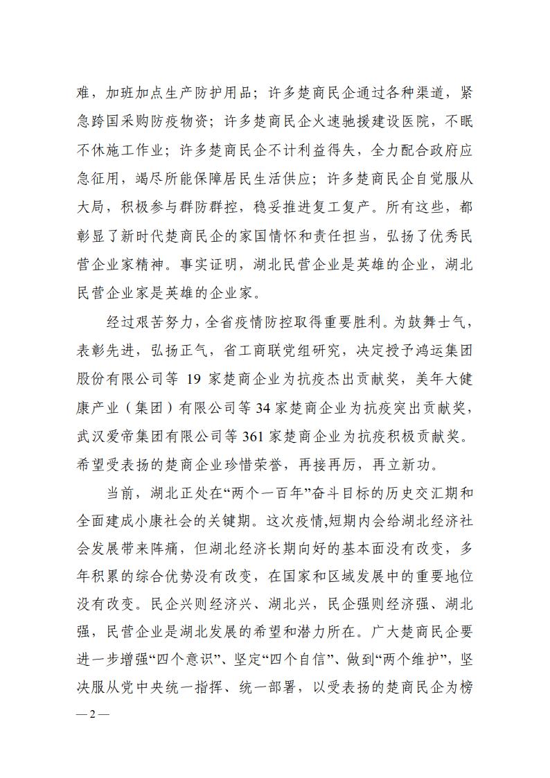 近日,湖北省工商聯(lián)(總商會(huì))十二屆四次執(zhí)委會(huì)召開,從會(huì)上獲悉,在此次抗擊新冠肺炎疫情中,廣大楚商民企成為湖北抗疫阻擊戰(zhàn)中一支重要力量,楚商民企捐款捐物達(dá)15.88億元,彰顯了新時(shí)代楚商的責(zé)任擔(dān)當(dāng)和家國(guó)情懷。為鼓舞士氣,表彰先進(jìn),弘揚(yáng)正氣,省工商聯(lián)黨組研究,決定授予運(yùn)鴻集團(tuán)股份有限公司等19家楚商民企為抗疫杰出貢獻(xiàn)獎(jiǎng),美年大健康產(chǎn)業(yè)(集團(tuán))有限公司等34家楚商民企為抗疫突出貢獻(xiàn)獎(jiǎng),武漢愛(ài)帝集團(tuán)有限公司等361家楚商民企為抗疫積極貢獻(xiàn)獎(jiǎng)。