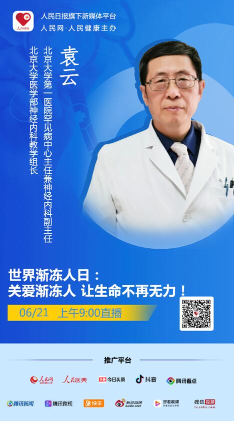 今年6月21日是國際第20個“漸凍人日”,但我們對“漸凍人癥”這種罕見病的了解仍然極為有限。2020年6月21日(周日)9:00-10:00,人民日報社旗下新媒體平臺“人民好醫生”客戶端邀請北京大學第一醫院罕見病中心主任兼神經內科副主任,北京大學醫學部神經內科教學組長袁云進行視頻直播訪談,讓更多人知道被稱為漸凍人的這一罕見疾病的相關知識。