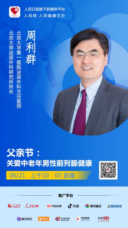 在父親節即將到來之際,人民好醫生客戶端邀請北京大學第一醫院泌尿外科主任醫師、北京大學泌尿外科研究所所長周利群,為我們科普前列腺癌及泌尿健康的知識。希望讓更多人能夠關注男性健康,了解前列腺疾病,讓更多患者能夠及早確診及早得到有效的治療,擁有更多時間和兒女一起,享受天倫之樂。