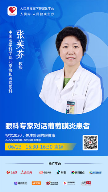 2020年06月23日(周二)15:30-16:30,“人民好醫生”客戶端將邀請中國醫學科學院北京協和醫院眼科主任醫師張美芬教授進行視頻直播,為大家在線詳細講解葡萄膜炎這種疾病,千萬不要錯過。