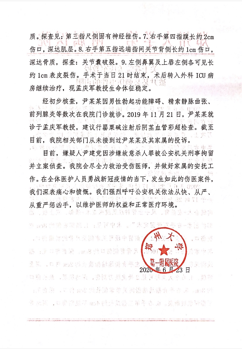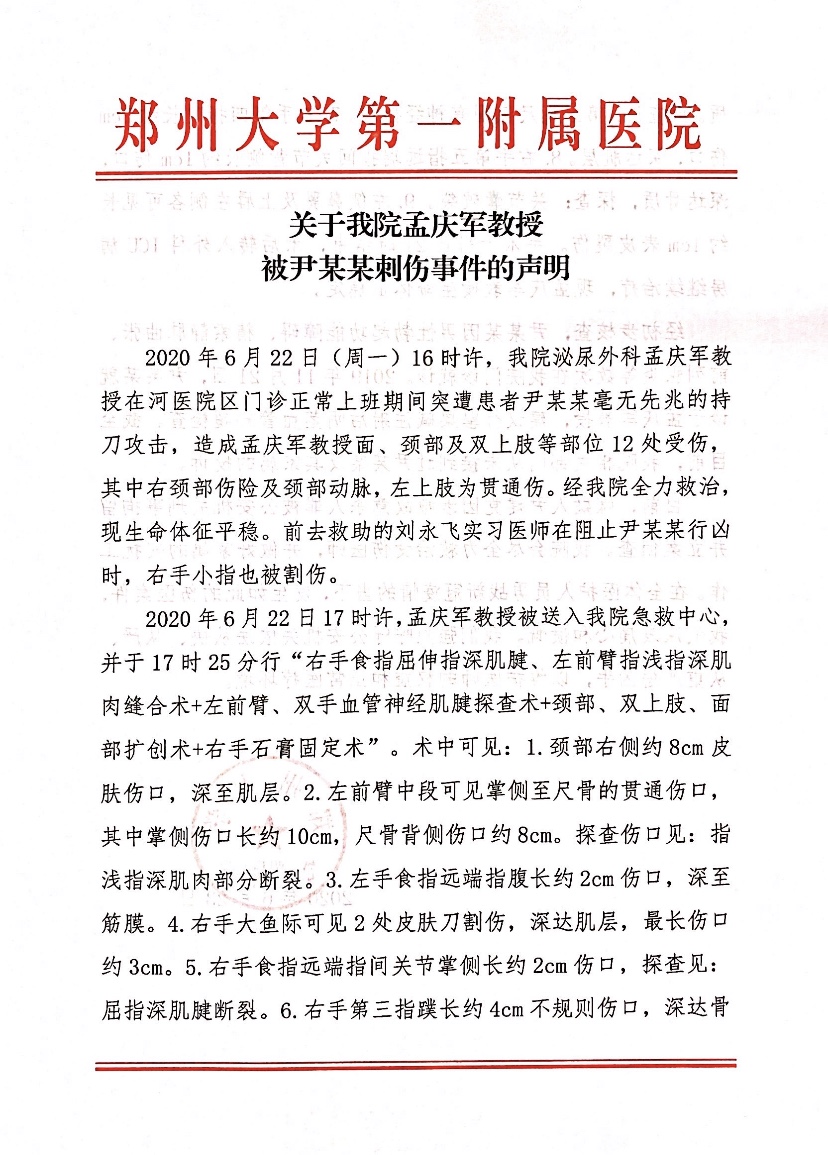 鄭大一附院兩醫生出診時被砍傷 醫院發布官方聲明