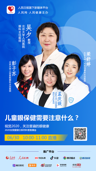 2020年06月30日(周二)10:00-11:00,“人民好醫生”客戶端將邀請北京大學人民醫院眼科主任醫師吳夕教授一行進行視頻直播,為大家詳細講解兒童近視、弱視與斜視的診療,科普早治療、早恢復的重要性,千萬不要錯過。