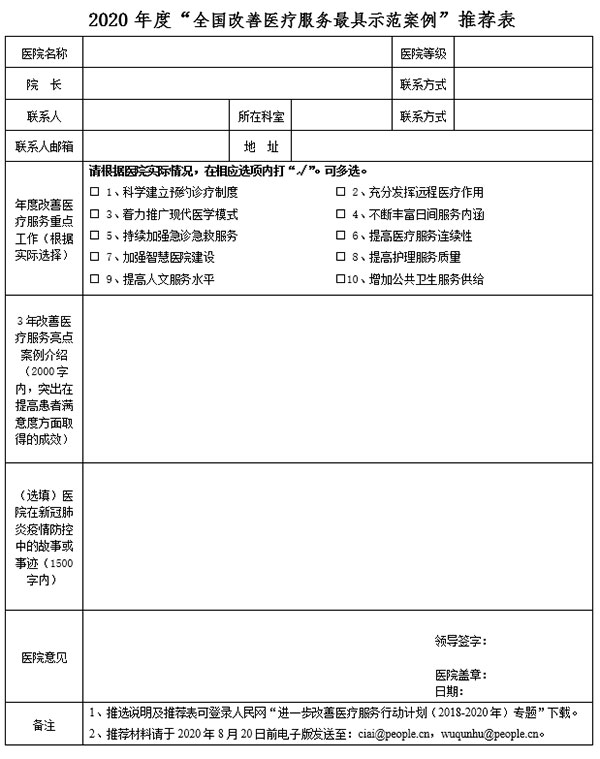 2020年度“全國(guó)改善醫(yī)療服務(wù)最具示范案例”推薦表