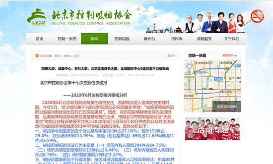 人民網(wǎng)北京7月2日電(王國(guó)菁)2日,北京市控?zé)焻f(xié)會(huì)官網(wǎng)發(fā)布《北京市控?zé)焻f(xié)會(huì)第十七次控?zé)熜畔⑼▓?bào)》(以下簡(jiǎn)稱《通報(bào)》)!锻▓(bào)》顯示,根據(jù)北京市控制吸煙協(xié)會(huì)“無(wú)煙北京”微信公眾投訴舉報(bào)平臺(tái)統(tǒng)計(jì),2020年6月1日至6月30日共收到公眾對(duì)違法吸煙行為的投訴舉報(bào)線索593件,平均每日接報(bào)19件。