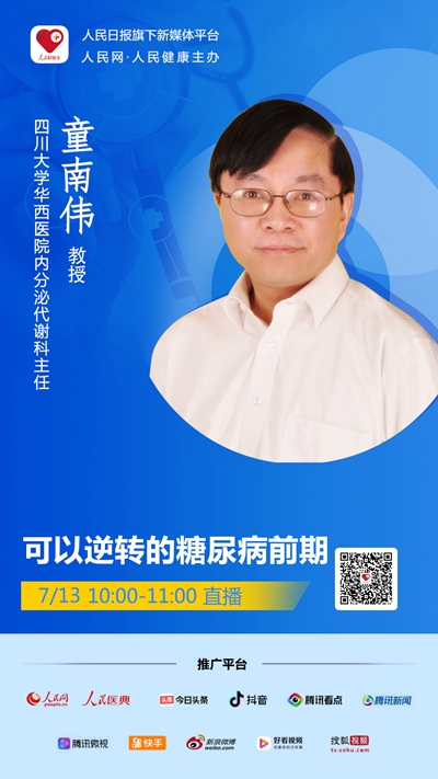 7月13日10:00-11:00,人民日報社旗下新媒體“人民好醫生”客戶端將邀請四川大學華西醫院內分泌代謝科主任童南偉做客直播間,和大家分享糖尿病早期的治療和疾病預防,歡迎大家觀看。