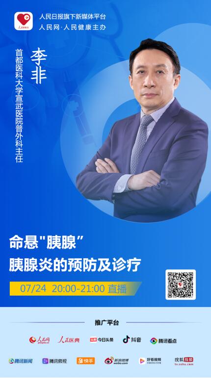 2020年7月24日 周五 20:00-21:00,人民日報社旗下新媒體“人民好醫生”客戶端將邀請首都醫科大學宣武醫院普外科主任李非進行視頻直播,為大家解答急性胰腺炎的預防及診療相關問題,千萬不要錯過。