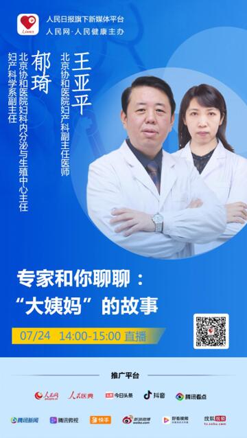 2020年7月24號14:00-15:00,人民日報社旗下新媒體“人民好醫生”客戶端將邀請北京協和醫院婦科內分泌與生殖中心主任、婦產科學系副主任郁琦;北京協和醫院婦產科副主任醫師王亞平進行視頻訪談,在線分享“大姨媽”那些事兒。