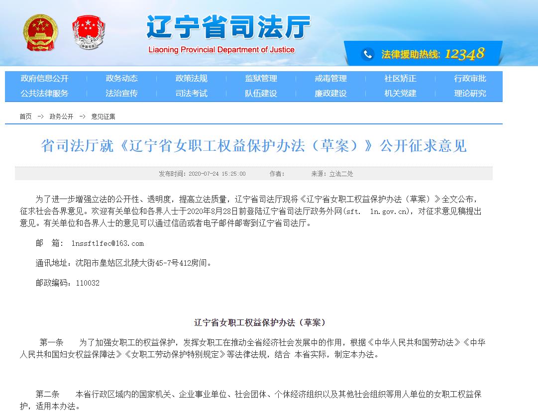日前,遼寧省司法廳就《遼寧省女職工權益保護辦法(草案)》向社會公開征求意見。草案結合遼寧實際,主要從女職工權益保護工作的職責分工、組織管理、女職工“五期”(經期、孕期、產期、哺乳期和更年期)保護、普法維權、獎勵與處罰等方面作出具體規定。