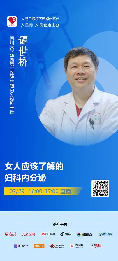 2020年07月29日(周三)16:00-17:00,“人民好醫生”客戶端將邀請四川大學華西第二醫院生殖內分泌科主任譚世橋教授進行視頻直播,為大家在線科普什么是婦科內分泌,讓大眾了解婦泌疾病,千萬不要錯過。