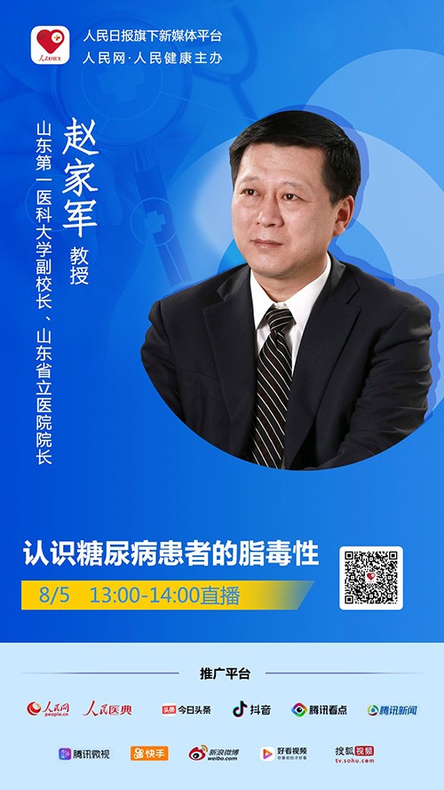 2020年08月05日(周三)13:00-14:00,“人民好醫生”客戶端將邀請山東第一醫科大學副校長,山東省立醫院院長趙家軍教授進行視頻直播,為大家在線科普什么是糖尿病患者的脂毒性,千萬不要錯過。
