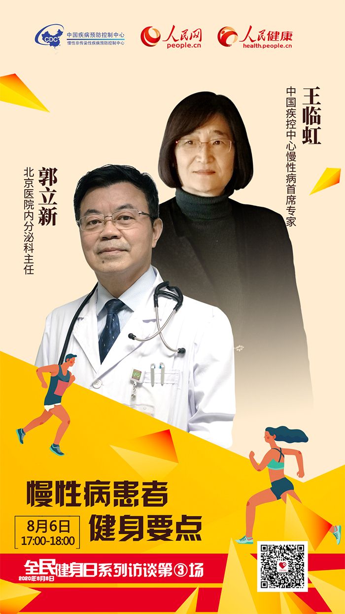 2020年08月06日(周四)17:00-18:00,“人民好醫生”客戶端將邀請中國疾控中心慢病中心首席專家王臨虹教授和北京醫院內分泌科主任郭立新教授進行視頻直播,為大家在線科普慢性病患者健身要點,千萬不要錯過。