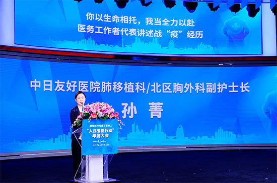 在大會“一線講述”環節,全國抗擊新冠肺炎疫情先進個人、中日友好醫院肺移植科副護士長孫菁講述了她的“戰疫”故事。