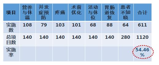 該醫院還對開展了特異評價指標的確定與追蹤,運用德爾菲法,按照lictter打分,確定高相關術后并發癥。確定快速康復特異質量評價指標:術前預康復落實率、術后早期活動落實率、深靜脈血栓集束化措施落實率、圍術期肺內感染風險措施落實率。以特異性指標為導向對并發癥發護理措施進行針對性的監管。