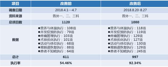 據了解,經過6個月的項目運行,該醫院取得了較好的效果,快速康復措施落實率由原來的54.46%提高至92.34%,提升37.88%。(表六)