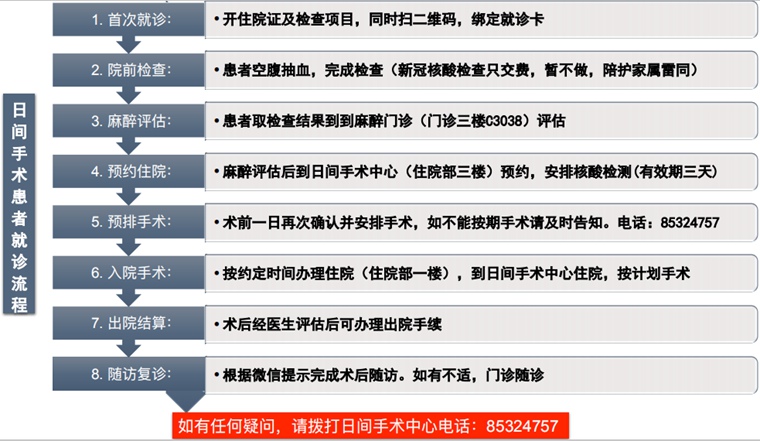 日間手術在歐美等發達國家已占擇期手術的80%以上,我國日間手術開展較好的醫院日間手術占比為40.5%,但大多數醫院日間手術開展率較低,主要由于沒有較好的管理平臺及管理模式參考。2019年之前,我院日間手術開展率也較低,存在同樣的問題。因此,我院建立了“基于麻醉手術部平臺的日間手術中心一體化管理模式”,該模式由醫務部主管、麻醉手術部主導,服務手術科室的綜合運轉模式。其管理團隊由科主任、護士長管理,設置6名醫生、7名護士、1名護理員完成日間手術中心患者圍術期醫護工作。同時,日間手術中心引進了信息化管理流程系統,即患者首次就診掃描二維碼,綁定就診卡,自動被納入信息化系統內,引導患者完成麻醉評估、手術預約、院前宣教、術前準備、手術知情、手術麻醉、術后恢復以及術后隨訪等全部圍術期醫療、護理工作,極大保障了患者的安全,真正實現了“一站式”醫療服務(圖1)。