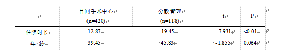 表1 日間手術中心及分散管理日間患者相關信息對比