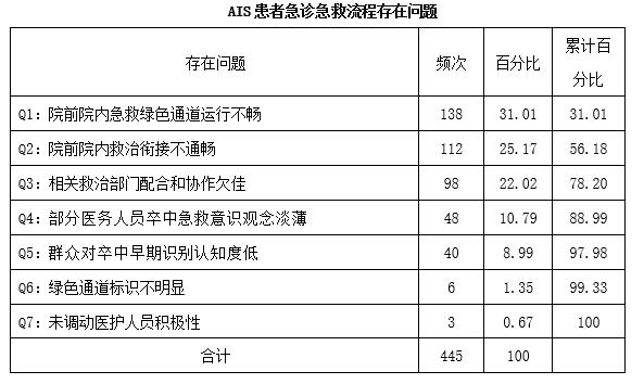 急診科腦卒中質量控制小組收集AIS患者急診急救流程存在問題,統計數據,并進行柏拉圖分析。