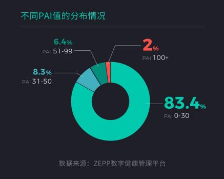 Zepp數(shù)字健康管理平臺(tái)通過監(jiān)測(cè)分析發(fā)現(xiàn),83.4%的人平均每天PAI值在0-30之間,僅有2%的人每天的PAI值達(dá)到或者超過100的理想狀態(tài);在這些人中,70后和70前的相對(duì)比例明顯高于其他年齡層。