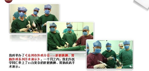 肝膽胰外一科是滄州市重點學科,以肝膽胰外科、微創外科為重點,科室技術力量雄厚、梯隊建設合理,既有經驗豐富的專家,又有學術活躍的中青年技術骨干。有多名同志擔任國內學術團體、河北省外科學會、肝膽外科、胰腺外科、內鏡與腹腔鏡學組及肝癌委員會常委、委員。