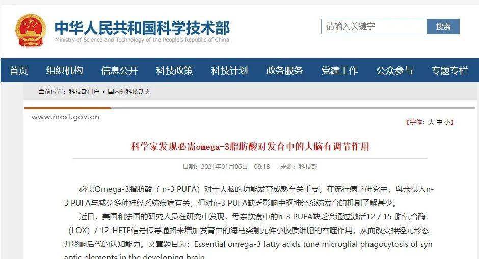 2021年1月6日,科技部官網(wǎng)最新發(fā)布的題為《科學(xué)家發(fā)現(xiàn)必需omega-3脂肪酸對發(fā)育中的大腦有調(diào)節(jié)作用》指出,必需Omega-3脂肪酸( n-3 PUFA)對于大腦的功能發(fā)育成熟至關(guān)重要。在流行病學(xué)研究中,母親攝入n-3 PUFA與減少多種神經(jīng)系統(tǒng)疾病有關(guān),但對n-3 PUFA缺乏影響中樞神經(jīng)系統(tǒng)發(fā)育的機(jī)制了解甚少。