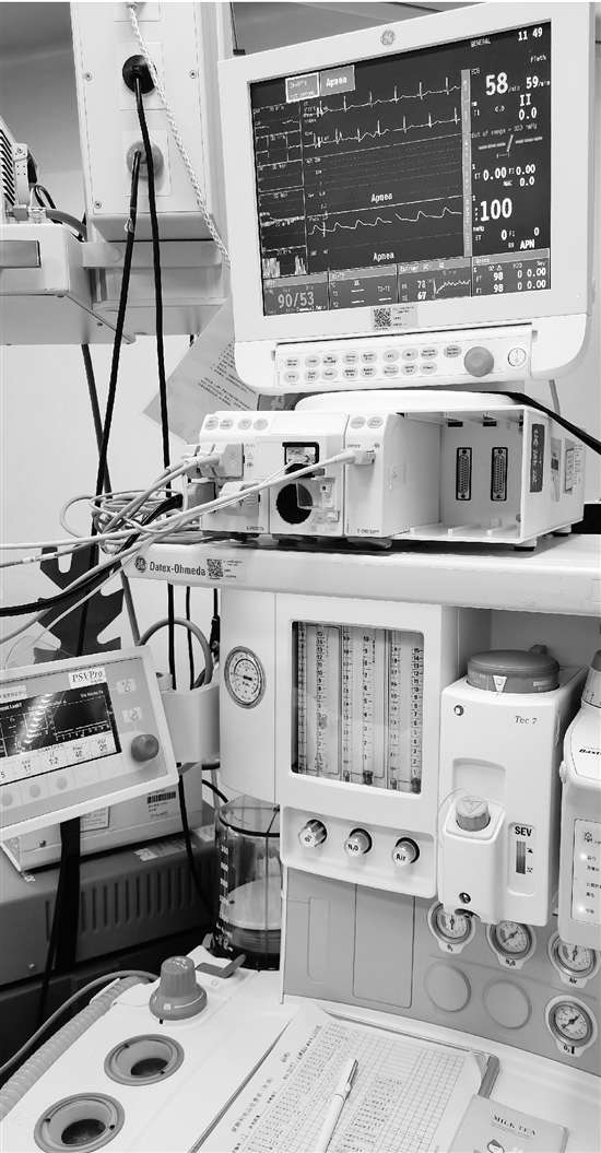 實施麻醉為什么需要這么多裝備?“因為麻醉會抑制呼吸,讓人缺氧。我們在麻醉的同時會給患者吸氧,多數全麻,還需要給患者氣管插管,人工呼吸,就是為了避免意外。麻醉會讓人嘔吐,失去意識后,嘔吐可能會堵塞氣道。”周大春說,“如果沒有這些設備,我也不敢給人實施麻醉。”
