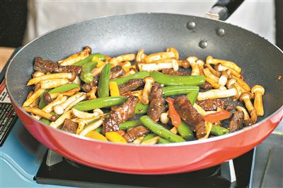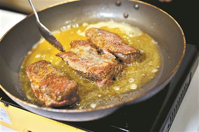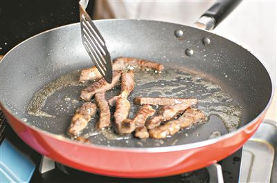 4.另起油鑊,牛肉單獨(dú)煎(圖③);