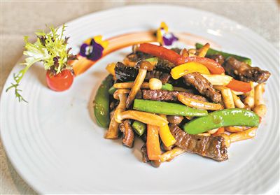 5.洗鑊后煎蟹味菇,煎至蟹味菇金黃色時(shí),加少許鹽,后放入牛肉,再加燒汁撈一撈;