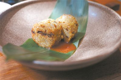 在不少素食店里,廚師會充分利用當季食材,不時不食的廣府飲食理念也更為凸顯。慈姑、金桔都是春季的食材,因此被天水蔬食料理運用到“雨水”節氣的菜單里。據店長介紹,慈姑是生長于水中植物,如同土豆一般軟糯。廚師用南乳和腰果做成堅果醬,作為慈姑的配搭醬料。慈姑被切成片,中間夾著梅菜,再用堅果醬“粘合”起來,還原慈姑原本的形狀,再通過烤箱烤制,再配搭撒上意大利黑醋的臺山花菜,口感豐富。金桔用來做甜品,將金桔挖空,里頭放入一個核桃,表面再鋪上一層風干的金桔果干,做成一件小巧甜品“金桔核桃糖”,其設計靈感源自廣東金桔糖。與它一同出場的還有用金桔果肉打醬做成的金桔年糕,也十分甜美。