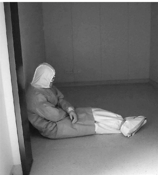 ▲抗疫期間,結束工作的浙大一院急診科副主任李彤靠著ICU墻根睡著了。