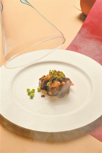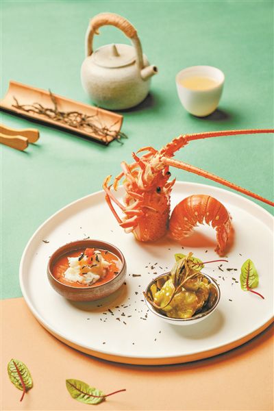 云南高山古樹普洱茶與去骨牛小排很合拍,將二者同煲入味,加上師傅自制特調燒汁烤至上色后,以普洱茶烘燃煙霧熏制,取茶之香與牛肉之鮮結合,成菜油光發亮,茶香宜人,肉質鮮嫩可口。除了牛小排,小青龍也可與普洱茶配伍,師傅選用云南生普茶,并特意烹制兩種不同做法的長風茶小青龍,為春日美味增添多一種選擇。第一種做法,師傅在長風茶湯中加入雞蛋調味攪拌均勻后蒸熟,淋上用長風茶湯調制的百花芡汁,最后以紅魚籽點綴,菜品鮮嫩細滑,香氣撲鼻;第二種做法,師傅將腌制的龍蝦球加入長風茶粉后炸至金黃色,最后用長風茶沙律醬攪拌后加上原條長風茶尖點綴,擺上龍蝦造型,視覺、嗅覺和味覺上給人意想不到的驚喜。