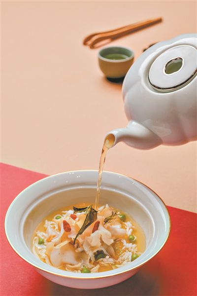 素以“色綠、香郁、味甘、形美”四絕稱著的杭州西湖獅峰山明前龍井茶,用雞湯泡制至出味后,雞湯之鮮與龍井茶之香渾然一體。這是一道“龍井沖浪響螺片湯”,出自廣州W酒店紫艷中餐廳劉均平師傅之手,他根據季節時令,結合飲茶養生概念以茶入饌,將香茗與佳肴結合,呈現創意粵式菜品。他將響螺切片后放入湯中浸泡15秒鐘至口感軟糯,湯水清甜不濁,清鮮帶有幽幽茶香。不僅是龍井,河南信陽毛尖茶葉也與雞湯能搭,將它放入濃雞湯中浸泡至出味,同時加入春日特色菜春筍絲和春菜苗搭配,綠色撲面而來。