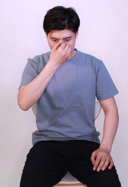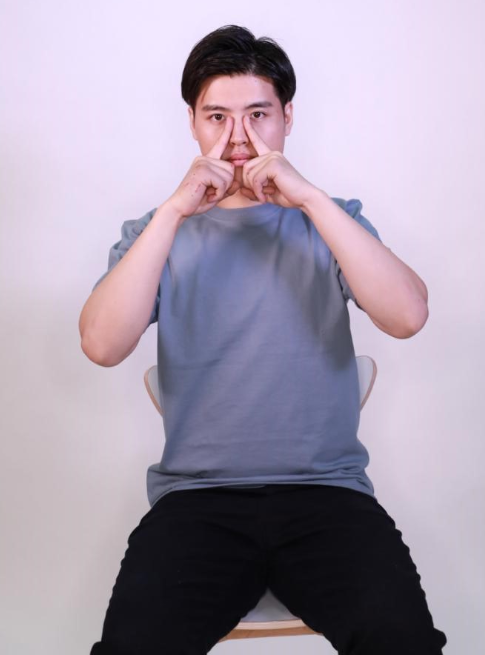 用大拇指和中指指腹捏住鼻梁的兩側,從上往下捏鼻梁10遍。