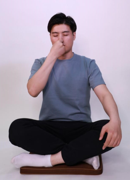 兩腳交叉而坐,兩膝相距與肩同寬(古稱箕坐)。再用鼻子慢慢吸氣,吸氣末屏氣。這時用右手大拇指和食、中二指捏住鼻翼,左右捻動,然后閉上眼睛,保持三秒,然后慢慢松開手指,同時緩慢用鼻子把氣呼出,反復進行3次。
