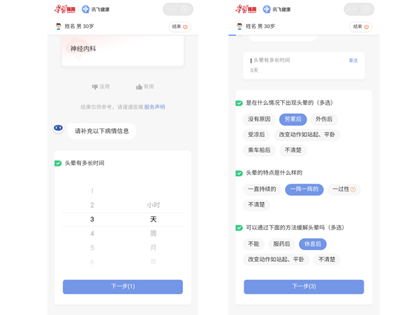 “訊飛健康”是由科大訊飛聯(lián)合“學習強國”學習平臺共同推出,利用語音交互、自然語言理解、醫(yī)學認知智能與推理技術等,實現(xiàn)智能導診、疾病自查等功能的智能服務助理。用戶進入智能導診頁面后,可以將病癥情況以文字或語音的形式描述出來。系統(tǒng)基于醫(yī)療問診數(shù)據(jù),詢問用戶分診癥狀的詳細誘因、癥狀性質(zhì)等信息,生成結(jié)構(gòu)化病歷。