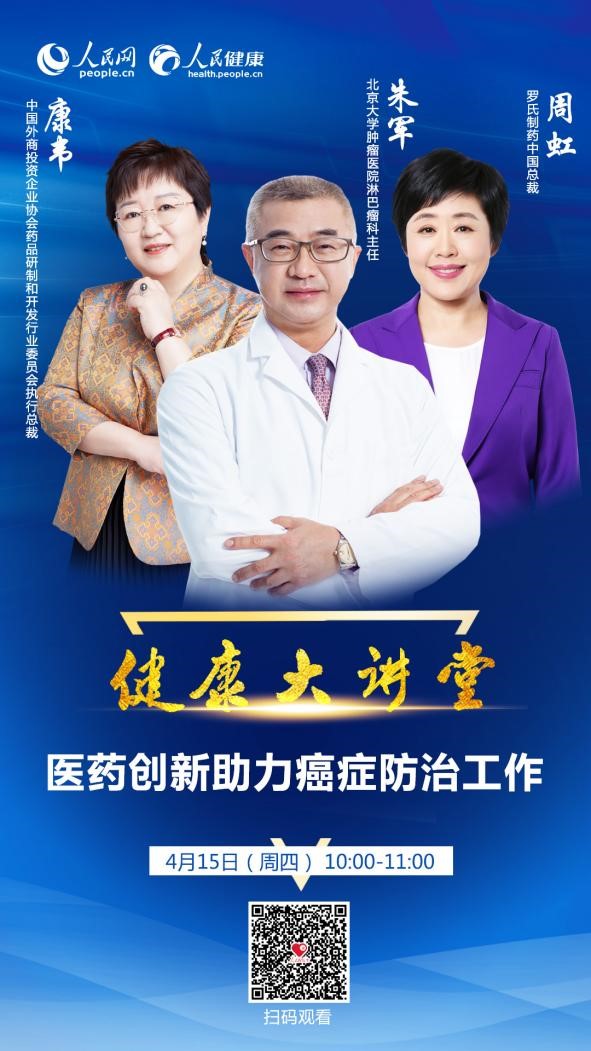 4月15日10:00-11:00,人民網·人民健康《健康大講堂》欄目邀請到北京大學腫瘤醫院淋巴瘤科主任朱軍、羅氏制藥中國總裁周虹、中國外商投資企業協會藥品研制和開發行業委員會執行總裁康韋進行直播,歡迎屆時收看。