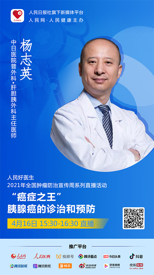 2021年4月16日(周五)15:30-16:30,中日醫(yī)院肝膽外科主任醫(yī)師楊志英將做客人民日?qǐng)?bào)社旗下新媒體“人民好醫(yī)生”客戶端,就“癌癥之王”胰腺癌的診治和預(yù)防為大眾答疑解惑。