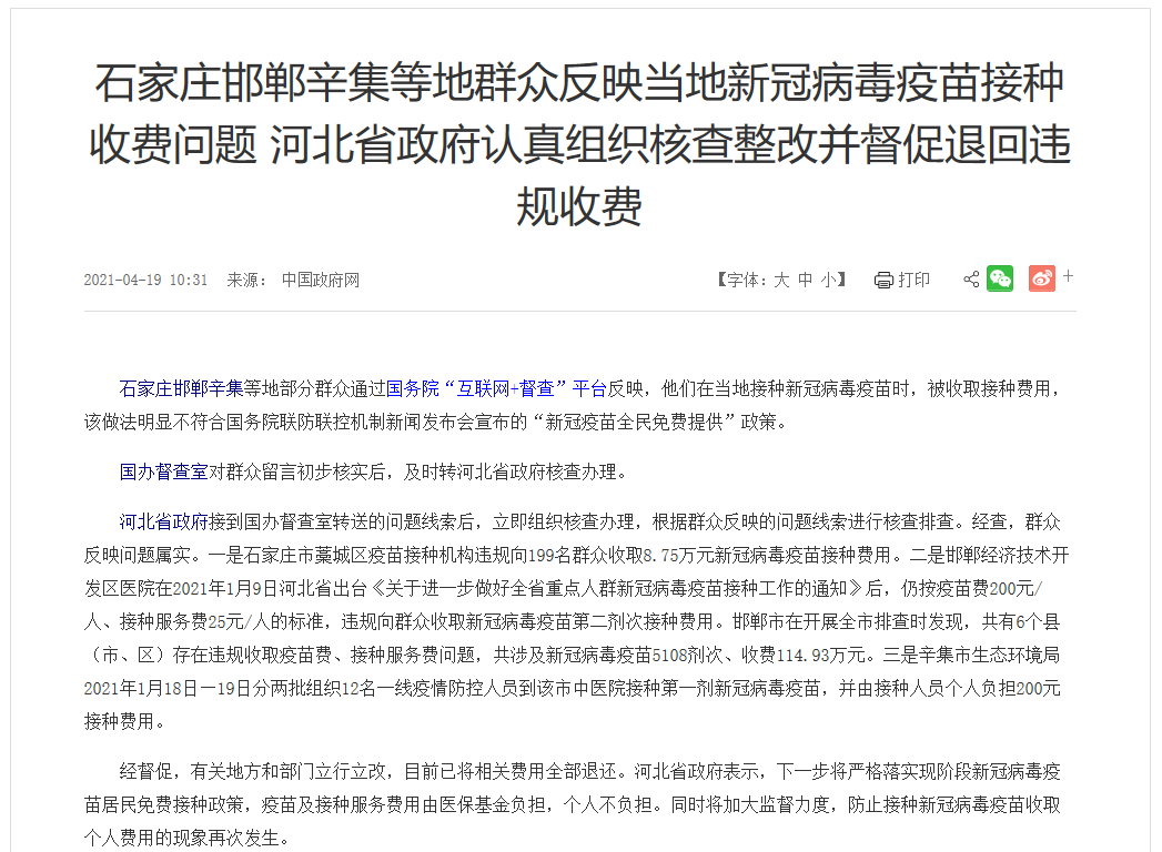 人民網北京4月20日電 (張文婷)近日,石家莊邯鄲辛集等地部分群眾通過國務院“互聯網+督查”平臺反映,他們在當地接種新冠病毒疫苗時,被收取接種費用,該做法明顯不符合國務院聯防聯控機制新聞發布會宣布的“新冠疫苗全民免費提供”政策。國辦督查室對群眾留言初步核實后,及時轉河北省政府核查辦理。